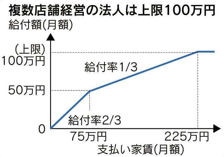 中型企业和中小企业等公司根据经营的店铺的数量,对支付金额的上限有变化。 如果您只拥有一家店铺,则每月50万日元(总计300万日元),如果拥有多家店铺,每月最高限额为100万日元(总计600万日元)。
