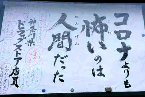 其实写出上面这句标语的是神奈川县一家药妆店的店员,看来在日本口罩物资短缺的期间,这名在药妆店工作的店员应该是感悟到了许多人情冷暖。确实,在疫情爆发期,许多人为了争抢口罩而丧失了理智,甚至在买不到口罩时还会拿店员撒气。也许正是在这样特殊的时刻,让他看到了人性最黑暗的一面吧!