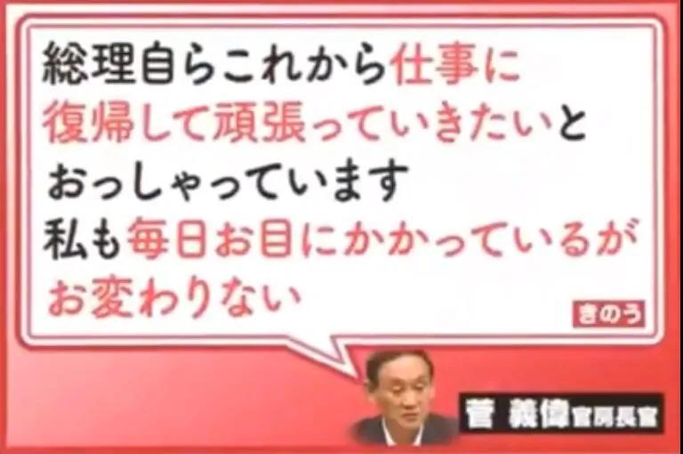 官房长官菅義偉称:总理自己也说了,今后会回归工作继续努力。而我每天和总理见面,并没有发现总理身体出现什么变化。