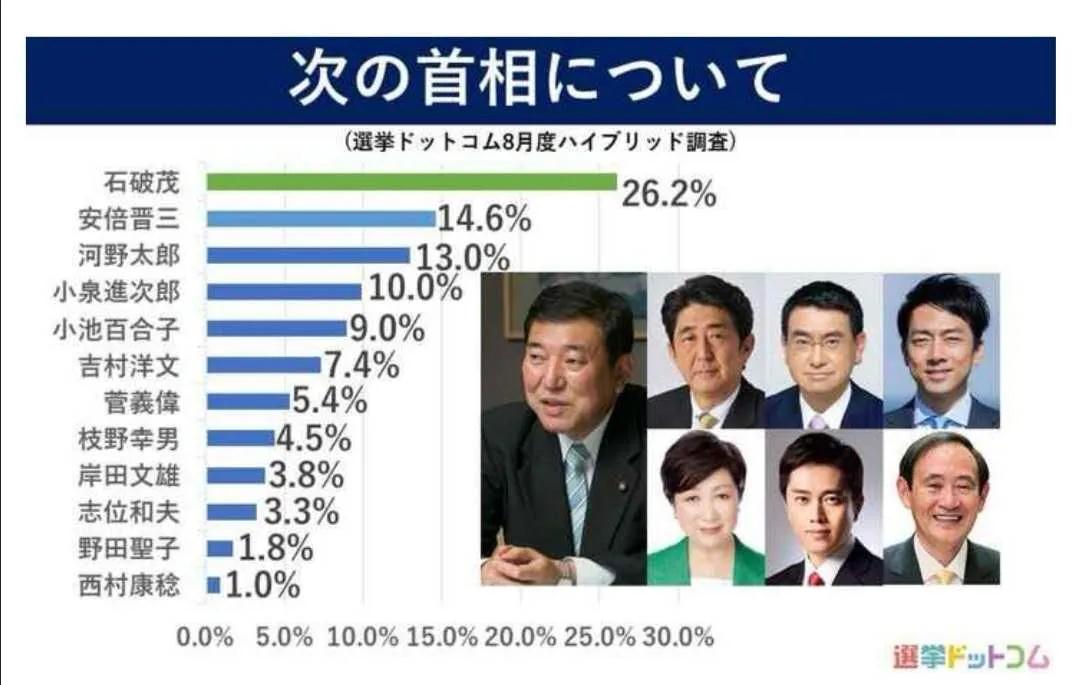 虽然对于安倍晋三的身体状况大家说来说去也没有得出一个准确的结论,并且安倍也有继续努力的意愿,但是日本人从民间到高层都开始讨论后安倍时期的日本政治走向却是一个不争的事实,近期更是有媒体做了一个你认为谁看上去更适合担任下一任日本首相的民意调查,我们一起来看一下: