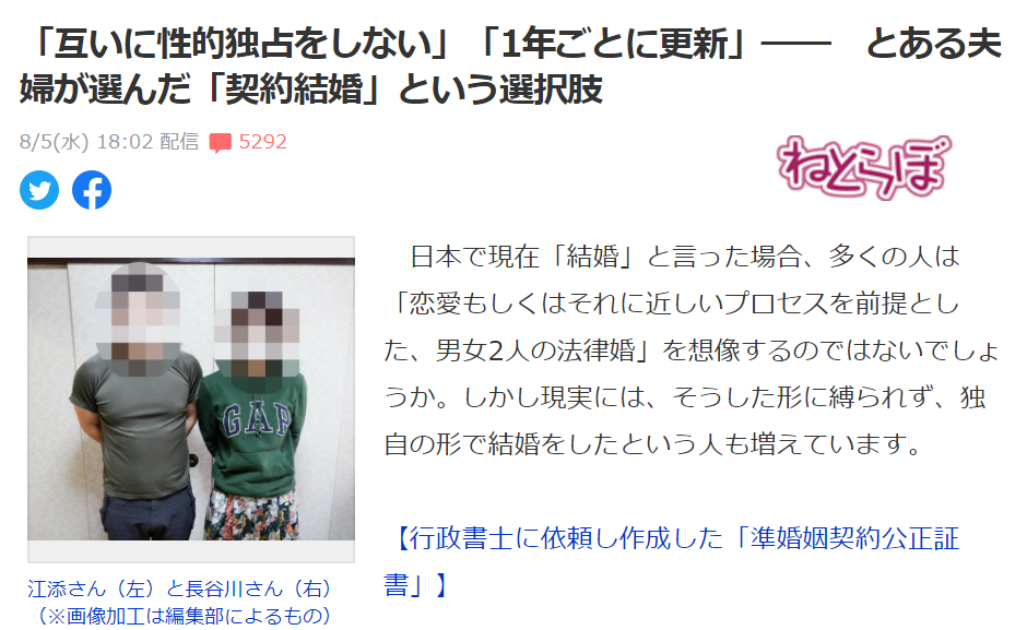 日本一对名为长谷川和江添的“夫妇”,已经在这种“契约婚姻”中度过了6年!
