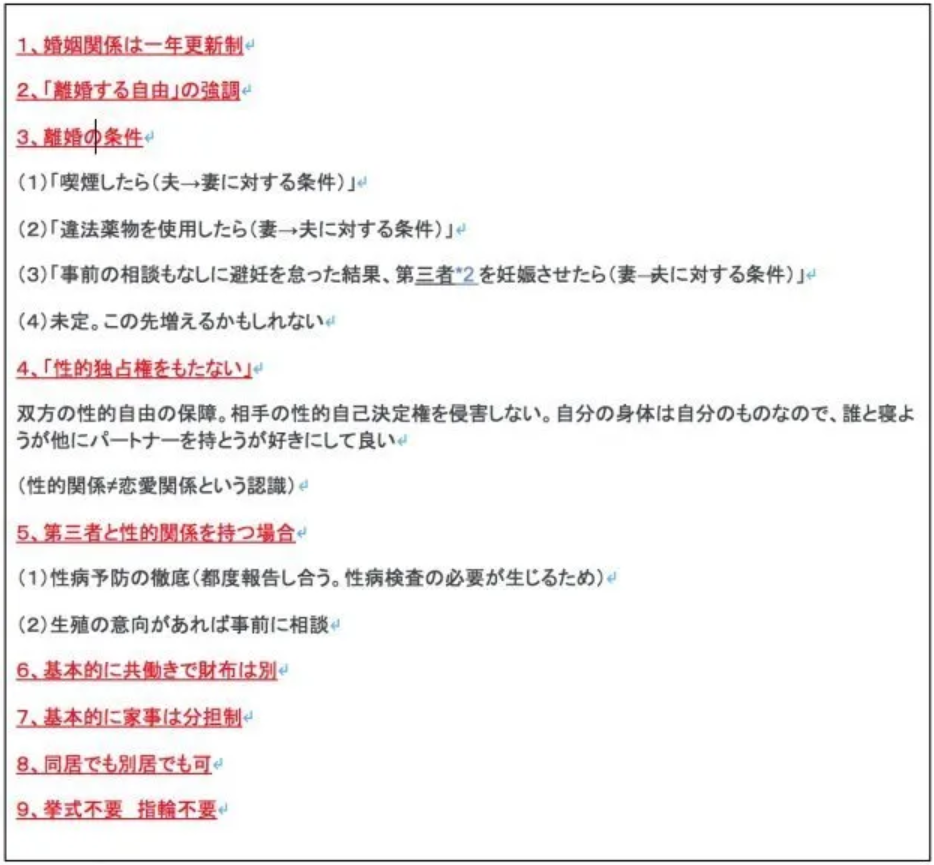 其中最显眼的是“一年更新制”、“离婚自由”、“性病预防”、“财务独自”、“不要婚戒不要婚礼”和“在婚外生了孩子怎么处理”等细微要点…