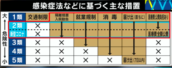 新冠肺炎蔓延初期,由于这种传染病的未知性和极高的传播速度,日本政府迅速将其归入「指定感染症法」,定为同结核病、非典同等级的2类传染病。仅此于最高级别传染病——埃博拉出血热和黑死病(鼠疫)。
