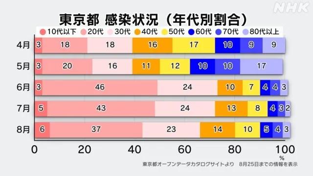然而,从目前日本的新冠事态来看,近三个月60~70%的感染者都集中于二三十岁的年轻群体(粉色系)。