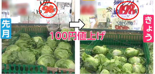 ▲“这里的卷心菜以往98日元一棵,现在都250日元了呢。”