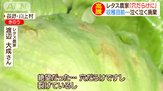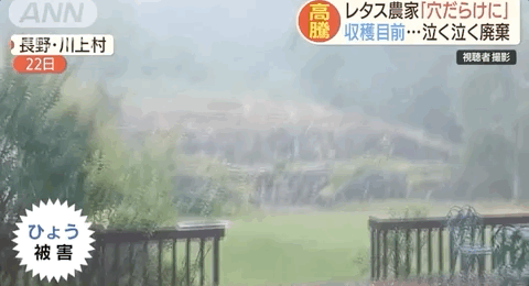 例如盛产生菜的长野地区,暴雨影响下直接造成了生菜田大面积受损,马上就要采摘的生菜全都没法再卖了。