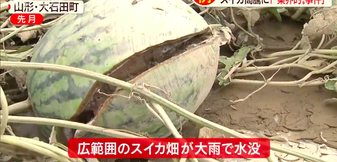 再例如山形县的瓜田在暴雨的摧残下,几乎全被淹没。等水退下去,瓜也基本都不是瓜了。