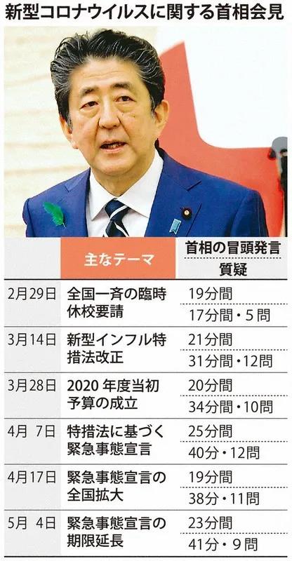 势头远超第一波的新冠疫情如何继续应对?低迷的经济如何重新振作?当下日本所面临的课题堆积如山。在抗疫初期,首相安倍的记者会频度可以说是创下了历年之最,半年的时间里大大小小开了14回,平均两周一会见,连续147天没有一天休息。在这期间,中小学停课、特措法修正、紧急事态宣言、全民抗疫补助……一系列措施也随之出台。