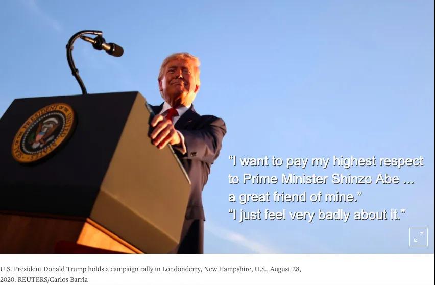 在得知安倍的突发离职后,特朗普今早在他的空军一号上表达了对这位老友的不舍、遗憾与敬意。